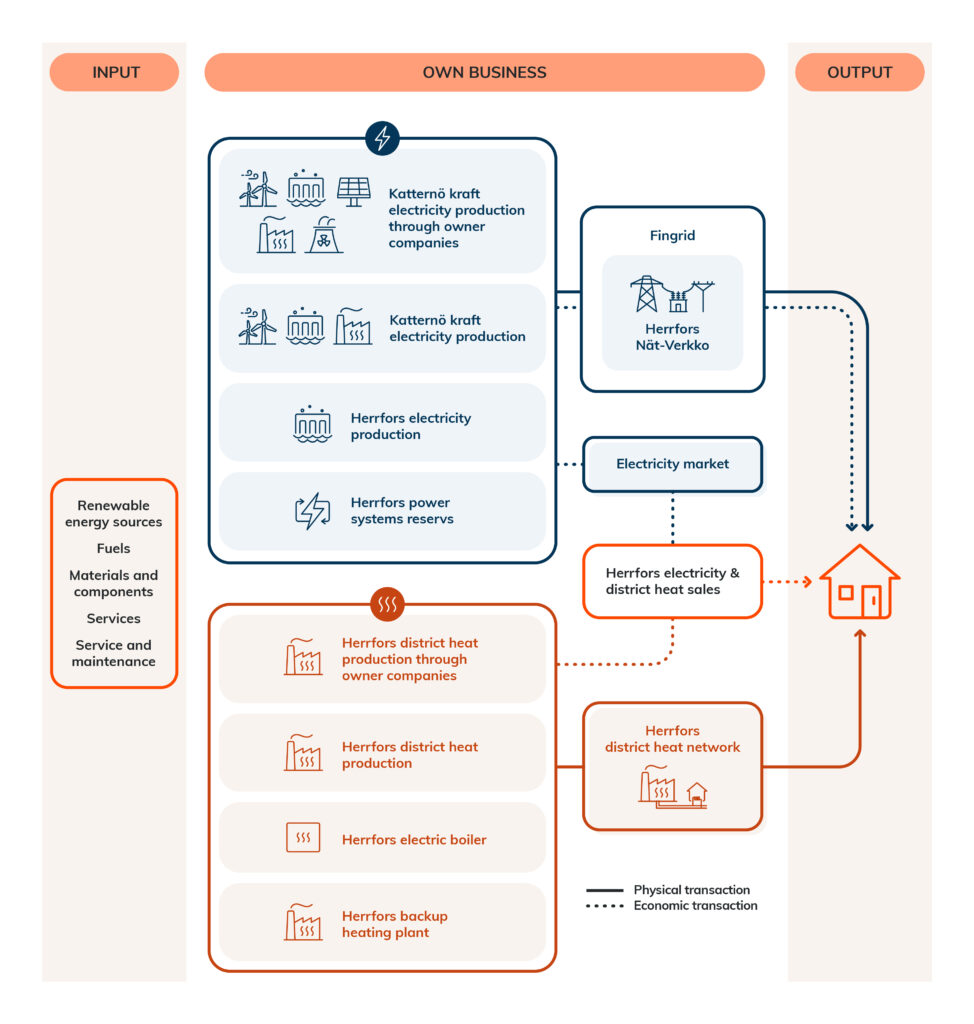 Herrfors group consists of several companies: Herrfors, Herrfors Nät-Verkko and production company Katternö Kraft. The illustration of the group’s value chain is divided into electricity and district heating production. Input (the part of the value chain that takes place before the company’s own operations) of our own operations are renewable energy sources, fuels, materials & components, services and maintenance, which are refined within our own operations.