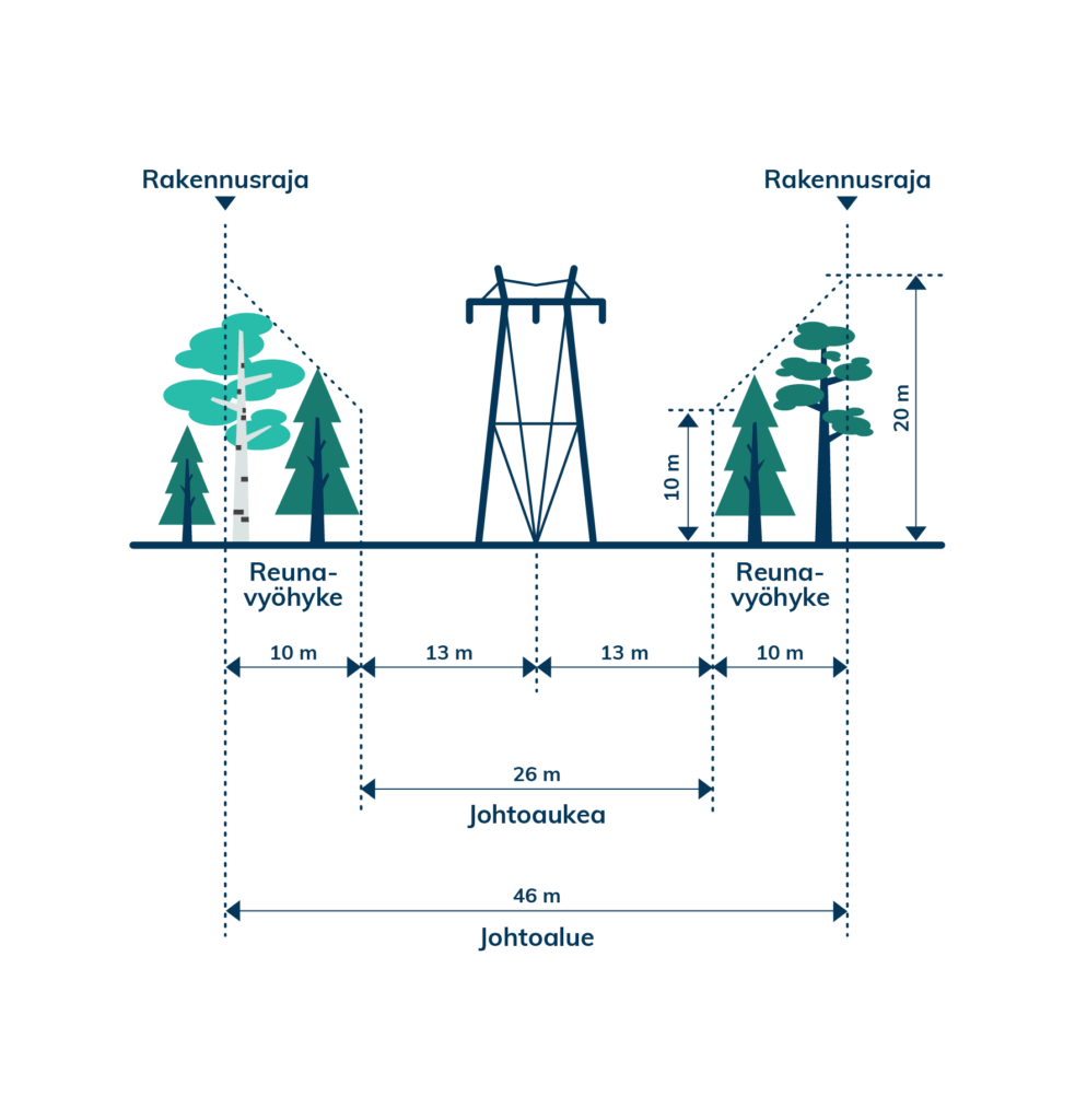 110 kV voimajohdoille on varattu niin kutsuttu johtoalue, johon meillä on käyttöoikeus. Tämä mahdollistaa johtorakenteiden sijoittamisen alueelle ja samalla rajoittaa alueen muuta käyttöä.
