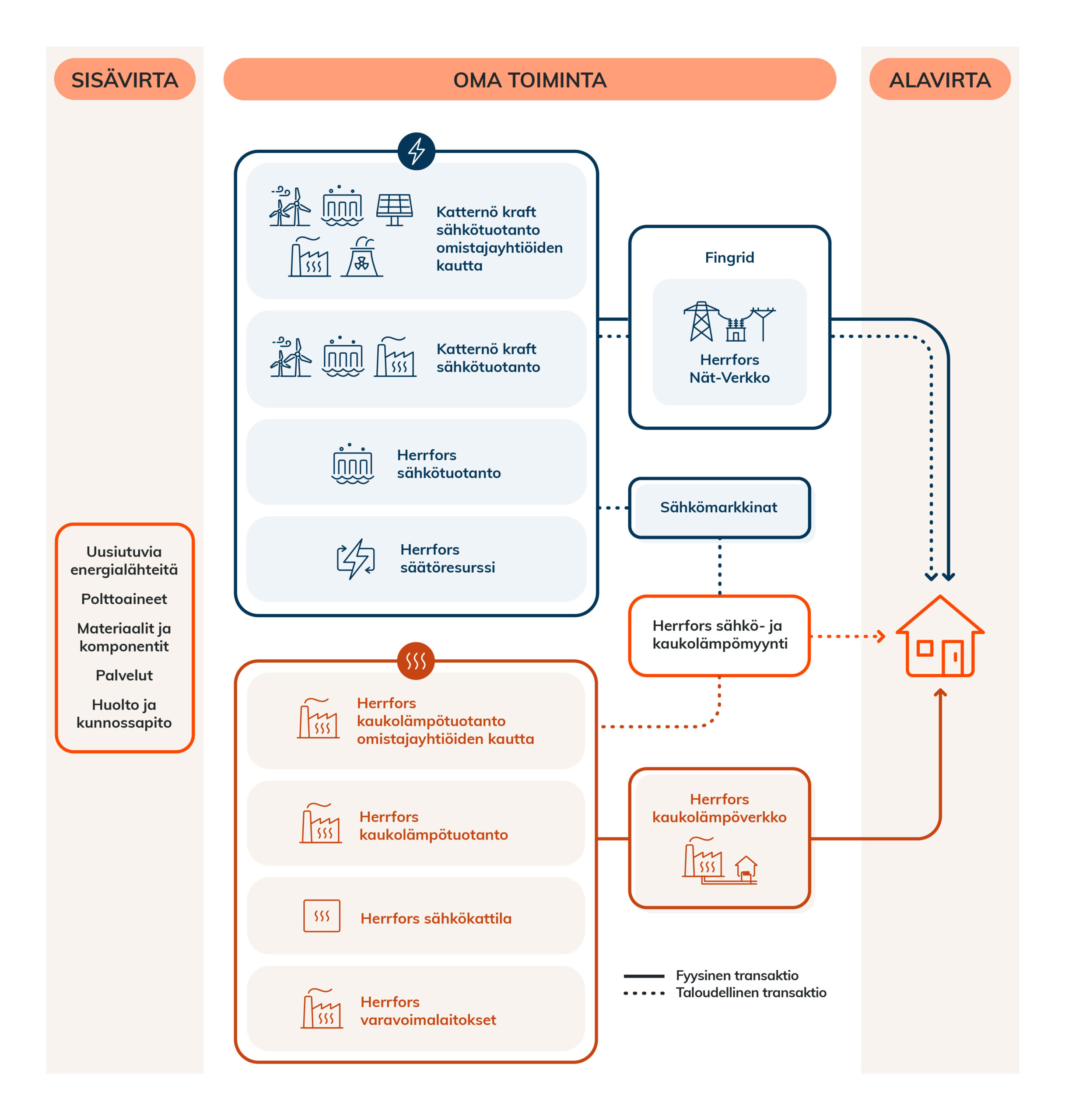 Herrforsilla on omaa sähköntuotantoa vesivoimalla sekä omia säätöresursseja. Katternö Kraft tuottaa sähköä omalla tuotannollaan, mutta saa sähköä myös omistajayhtiöidemme kautta. Sähkö toimitetaan fyysisesti sähköverkon kautta asiakkaille (alavirta: arvoketjun osa, joka tapahtuu yrityksen toiminnan jälkeen). Herrfors Nät-Verkko vastaa tietystä verkkotoiminta-alueesta seudulla, sisältäen sekä alueverkon että jakeluverkon. Taloudelliset transaktiot tapahtuvat sähkömarkkinoiden (NordPool ja Fingrid/eSett) sekä Herrforsin sähkönmyynnin kautta loppuasiakkaille.
