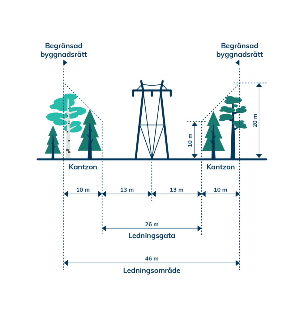 För 110 kV kraftledningar är ett så kallat ledningsområde reserverat, där vi har nyttjanderätt. Detta möjliggör placering av ledningsstrukturer och begränsar samtidigt annan användning av området.